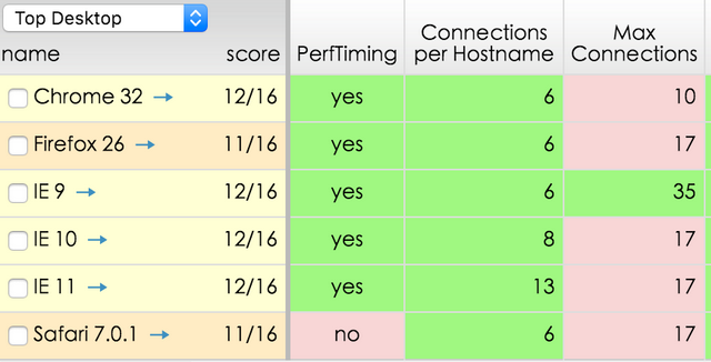 上圖展現了各瀏覽器的并行銜接數(同域名),能夠看到在一些現代瀏覽器內每個 hostname 的最大銜接數根本都是6個,IE 稍顯傲嬌,總體而言并發(fā)數不高。 所以 PC 年代對靜態(tài)資本優(yōu)化時,通常將靜態(tài)資本散布在幾個不一樣域,確保資本最完美地分域名存儲,以供給最大并行度,讓客戶端加載靜態(tài)資本更為敏捷。